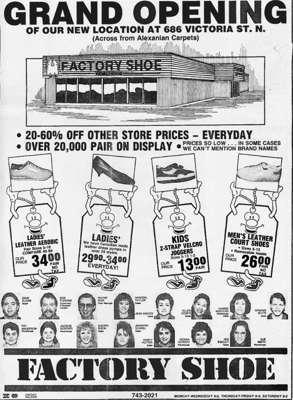 Factory Shoe's grand opening at 686 Victoria St. N. marked the beginning of a thriving business journey. Starting in London, Ontario, Factory Shoe quickly became known for its wide selection and unbeatable prices on various footwear. With over 20,000 pairs on display, the store's appeal grew, allowing Factory Shoe to expand from this single location into a successful chain of stores across Ontario.
