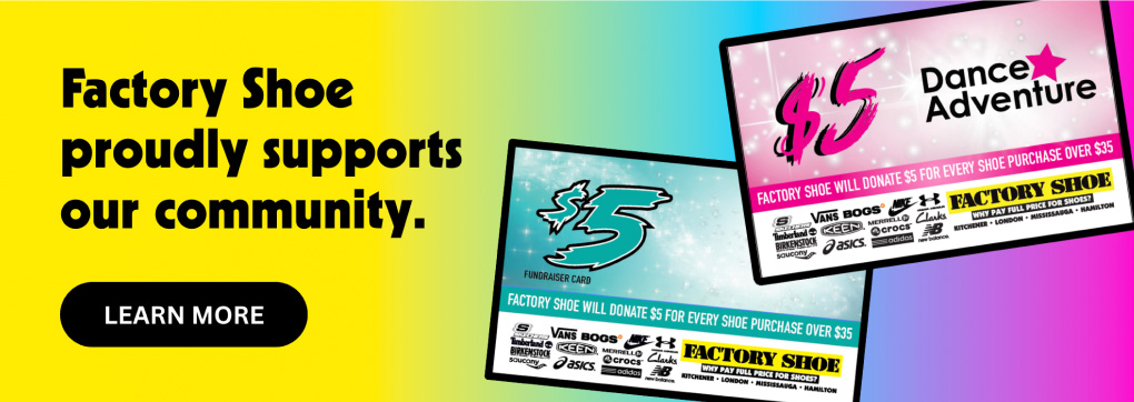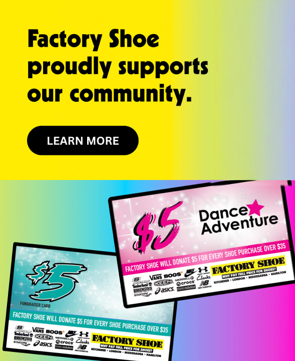Through Fundraising, Factory Shoe is proud to support the Brain Injury Association of Waterloo-Wellington. Go to their website and download their fundrasing barcode to contribute to this great cause.