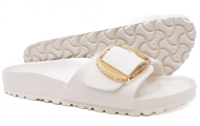 This is a new and modern interpretation of the BIRKENSTOCK classic Madrid. This version features our popular Big Buckle made from a stainless synthetic material and makes an impression with its durability and minimalist design. Modeled on the cork sandal, it is made from the ultra-lightweight and highly flexible synthetic material EVA. The high-quality, odor-neutral EVA has been tested for harmful substances and combines numerous positive attributes: it is very light, highly elastic, shock-absorbent, water-resistant, and skin-friendly.