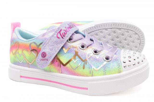 Light up the playground with heart-filled style wearing Skechers Twinkle Toes®: Twinkle Sparks - Ombre Love. This fun light-up sneaker features a metallic drip heart print fabric upper with glitter trim, satin stretch laces, adjustable instep strap, and a light-up rhinestone embellished toe.