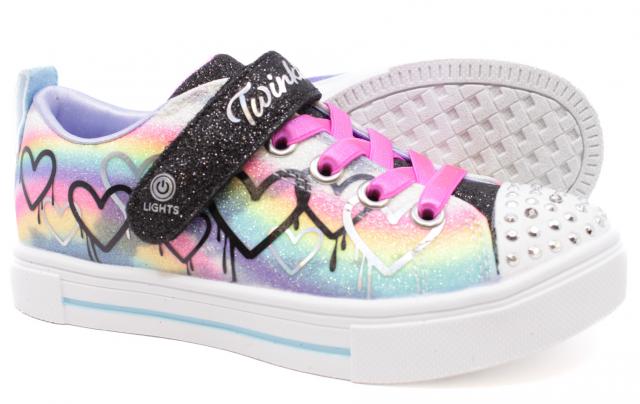 Light up the playground with heart-filled style wearing Skechers Twinkle Toes®: Twinkle Sparks - Ombre Love. This fun light-up sneaker features a metallic drip heart print fabric upper with glitter trim, satin stretch laces, adjustable instep strap, and a light-up rhinestone embellished toe.