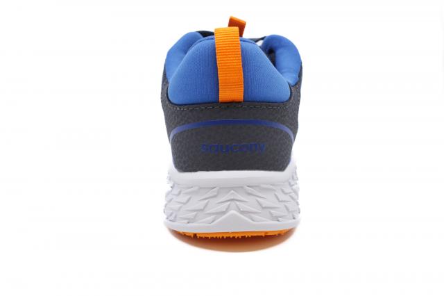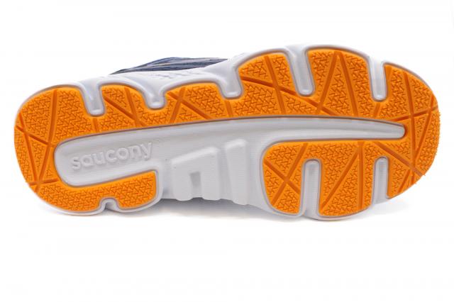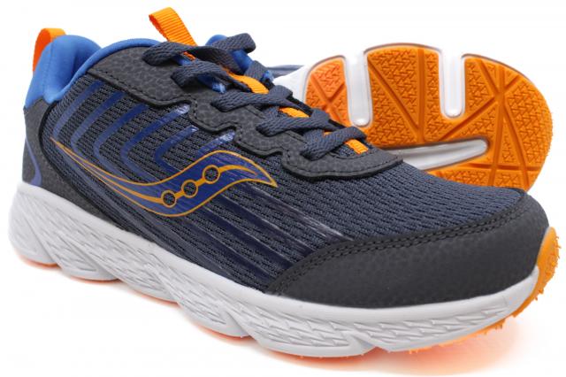 The Saucony Wind 3.0 Wide in Navy/Peel offers breathable comfort and a roomier fit—perfect for everyday play and activity.