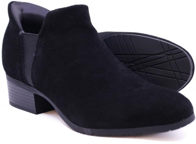A soft suede bootie features stretchy gore panels for easy on-offs along with a cushioned footbed and a stacked block heel.