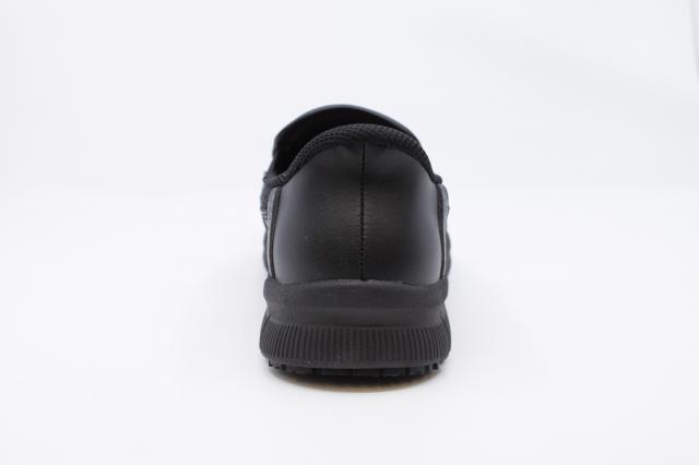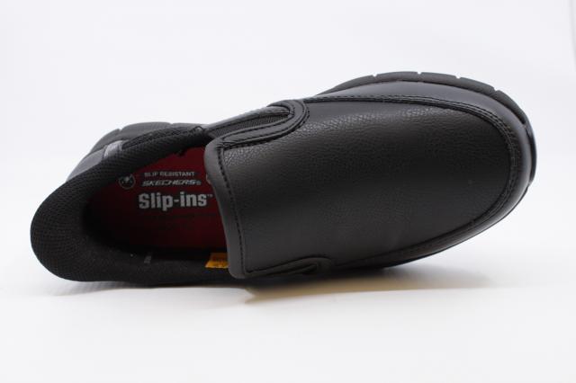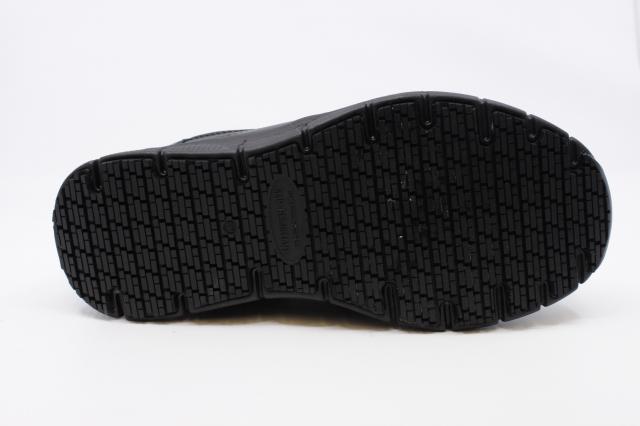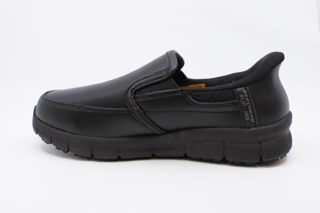 Stay comfortable and secure through long workdays in the Skechers Nampa-Engus. This classic slip-on work shoe combines a smooth black leather upper with elastic side panels for easy on and off. The memory foam cushioned insole and lightweight shock-absorbing midsole deliver all-day comfort, while the slip-resistant rubber outsole provides dependable traction on a variety of surfaces.